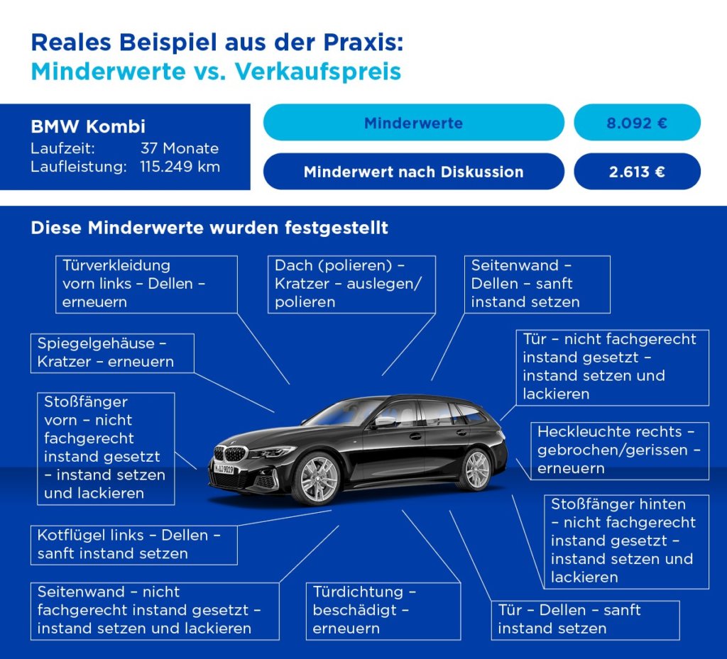 Also, so geht das mit dem Geldverdienen: Sie geben einen BMW Kombi 316d nach drei Jahren ab. Dann beurteilt ein Experte das Auto und stellt gravierende Minderwerte fest. Die sind häufig mit dem ungeschulten Auge nur schwer zu erkennen, aber mit der entsprechenden Technik kann man sie nachweisen: z.B. Lackschäden oder Reparaturen, die nicht „fachgerecht“, das heißt zum Beispiel nicht mit den teureren Originalteilen, durchgeführt wurden. Da das Ganze von einem Experten beurteilt wurde, denkt der Laie natürlich, das sei in Stein gemeißelt. Tatsächlich rief eine Expertin von ARI beim Leasingunternehmen an und gab zu bedenken, dass die berechneten Minderwerte, zumindest basierend auf ihrer Einschätzung, deutlich zu hoch sind. Nach dem Anruf einigte man sich statt 8.092€ auf 2.613€ netto. So spart man 5.000€ mit einem Anruf.